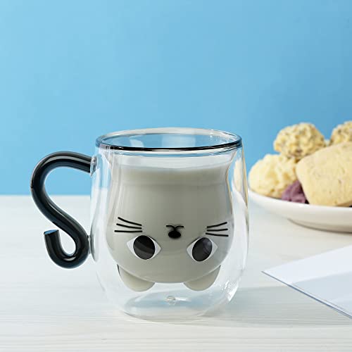 Qinhai Kattenmokken, dubbelwandige glazen theekopje, schattige koffiemok, Valentijnsdag Moederdag Pasen Halloween kerstcadeaus voor vrouwen vrouw moeder haar oma meisje leraar vriend, verjaardagscadeau idee (zwart)